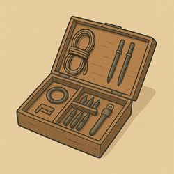| Beschreibung: Tücher, Waffenöl, Schleifstein. All die Dinge, um Waffen zu pflegen und hübsch zu polieren. | |
